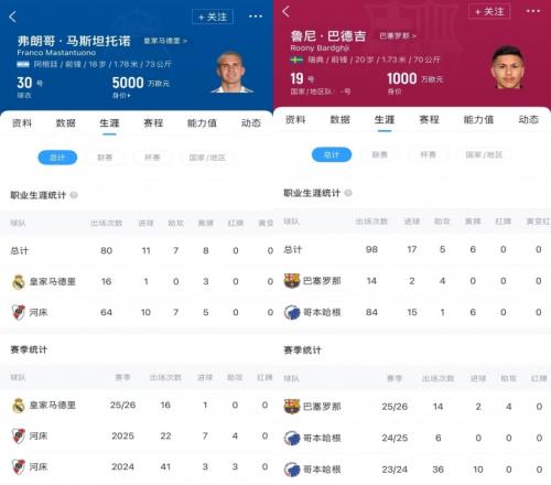 文章表示,巴德吉在在仅有的413分钟出场时间里,已经贡献了2个进球和4次助攻。而马斯坦托诺已经淡出了阿隆索的计划,在772分钟里仅有1个进球。两人最初都是B队注册球员。