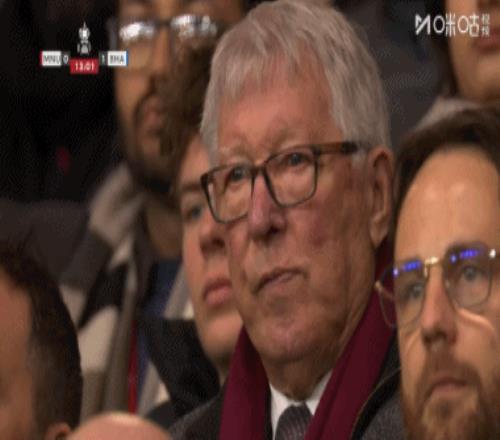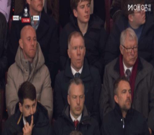 曼联01落后!镜头给到看台嚼口香糖的弗格森和一旁的斯科尔斯