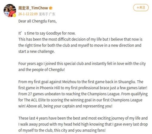 值得一提的是,在周定洋昨日社媒发文告别蓉城时,IP显示球员目前正在广东,综合体育播报报道以及相关传闻,球员加盟新鹏城在即,基本只待官宣。